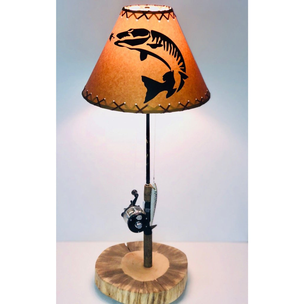 Our Muskie table lamp is perfect for the muskie fisherman out there. This lamp is 34"tall and is made using a St. Croix fishing rod, Abu Garcia reel, and a rapala lure for the lamp switch pull.
